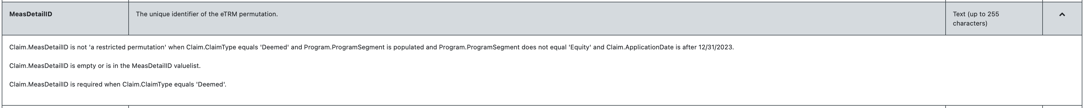 Claim.MeasDetailID is not a 'restricted permutation' when Claim.ClaimType equals 'Deemed' and Program.ProgramSegment is populated and Program.ProgramSegment does not equal 'Equity' and ApplicationDate > 12/31/2023.