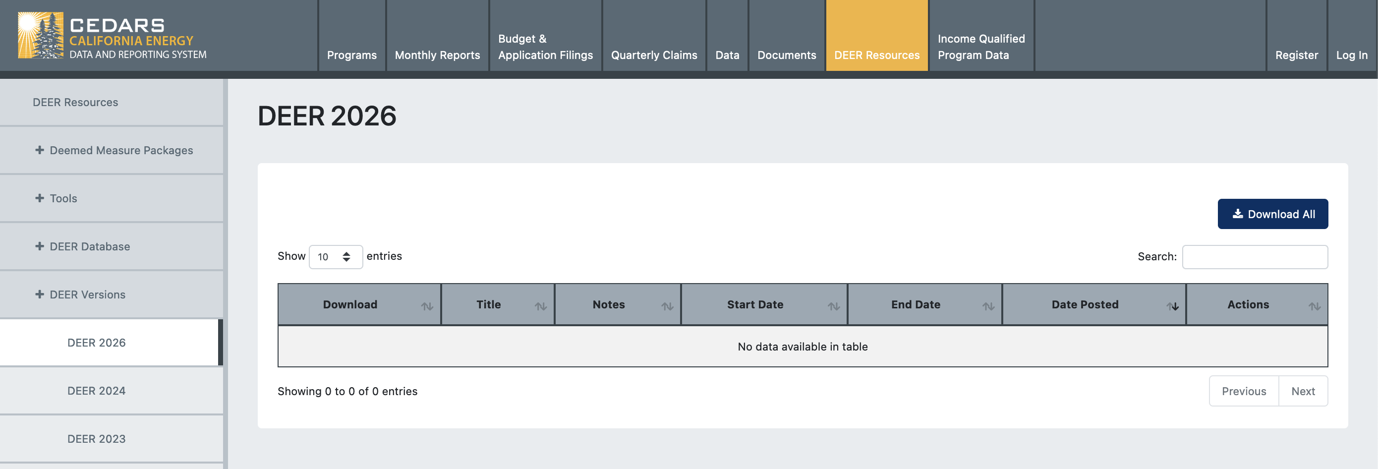 A new page was added in the DEER Resources tab for the new DEER 2026 version that will be coming out soon. As the project progresses, the DEER 2026 webinar slide deck, the draft resolution, and the scoping document, and ultimately the resolution will be available for download from this page.