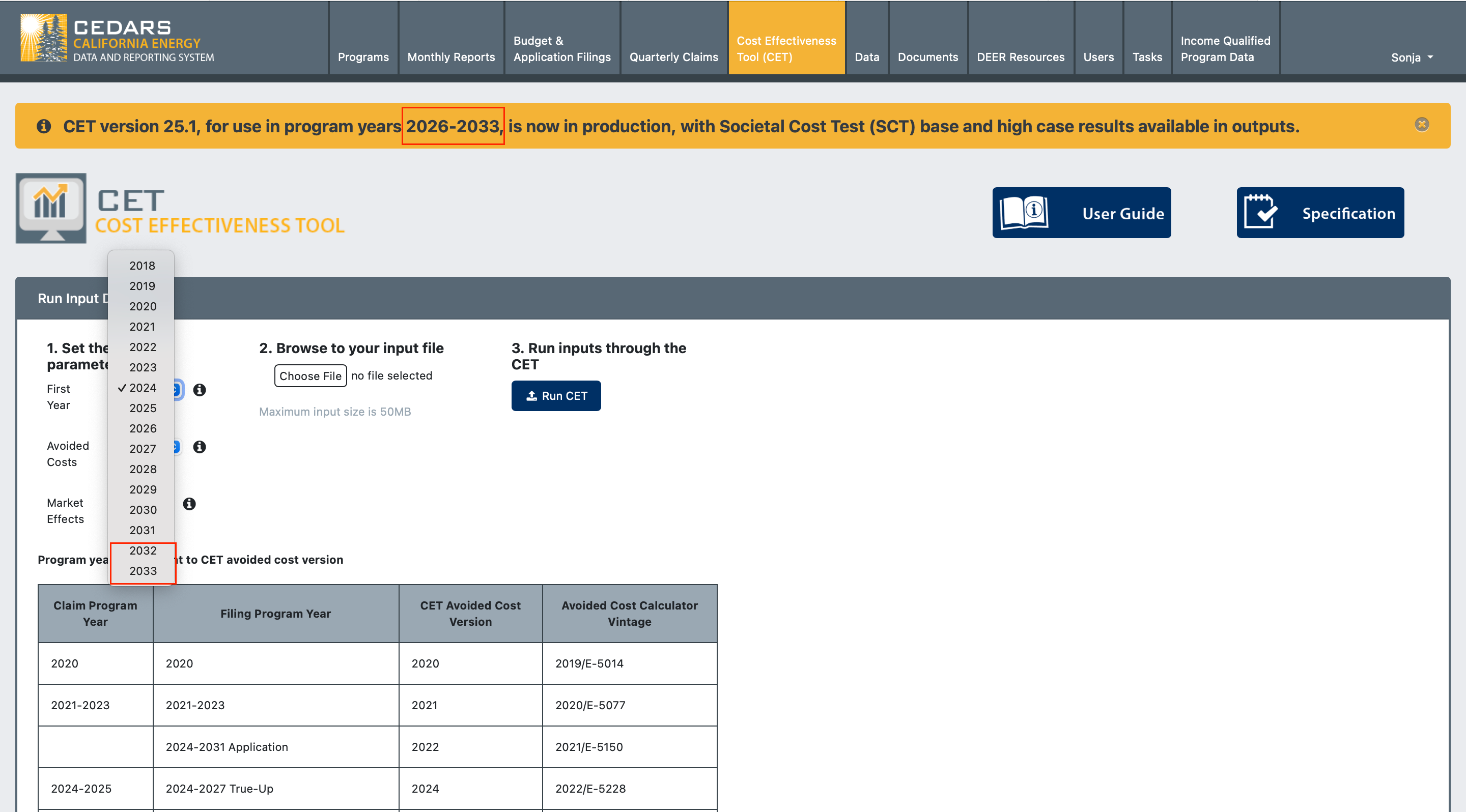 The Cost Effectiveness Tool (CET) now supports 2032 and 2033 as first year options.