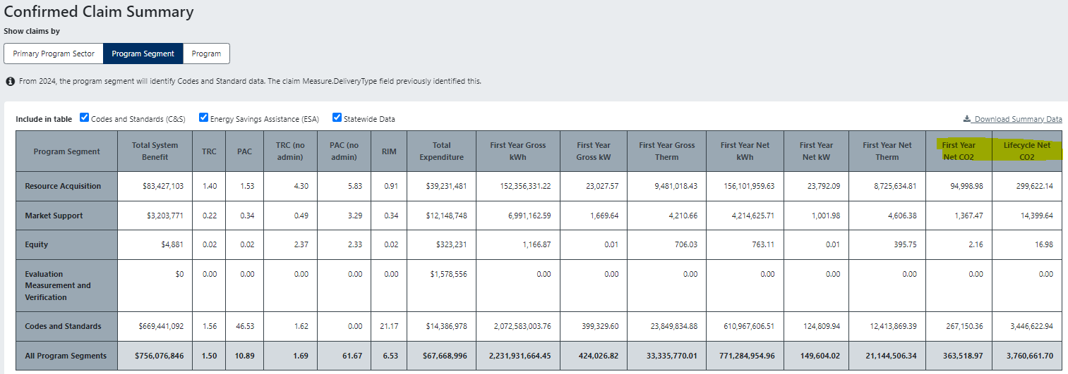 Starting in 2024 (using the 2024 Avoided Cost Version of the CET) all CO2 values will already be in metric tons. So, no conversion is needed for gas CO2. Please confirm and update claims program segment summary table results for First Year and Lifecycle CO2 accordingly.