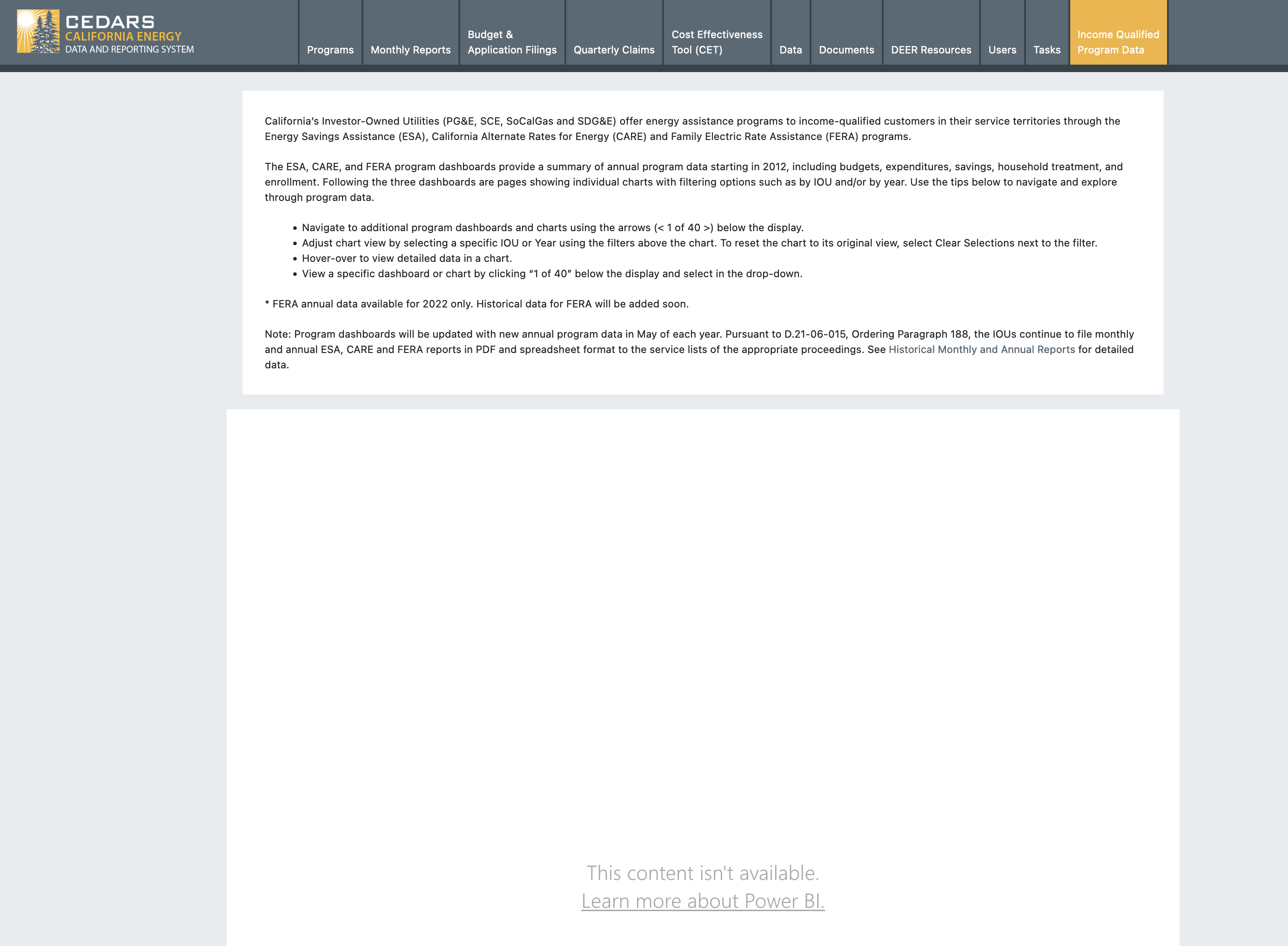 The income qualified program team will be providing a new URL for their PowerBI dashboard. When we receive the new URL we want to update CEDARS ASAP. The new URL will resolve the page from saying content is not available.